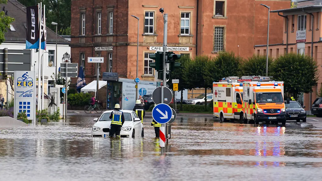 Unwetter und anhaltender Starkregen haben zu massiven Überschwemmungen und zahlreichen Notfällen in Teilen Bayerns gesorgt. Schwer betroffen ist etwa der fränkische Landkreis Neustadt an der Aisch-Bad Windsheim. Hier wurde der Katastrophenfall ausgerufen. Laut Landratsamt kam es vereinzelt zu Erdabrutschen und entwurzelten Bäumen. Auch zahlreiche Grundstücke stehen unter Wasser, Keller sind vollgelaufen. Der Unterricht an den Schulen sei eingestellt worden. Zahlreiche Straßen und Wege seien in dem Landkreis in der Nacht und am Vormittag überflutet worden. Im etwa 20 Kilometer entfernten Herzogenaurach warnte die Polizei vor einer 60 Zentimeter hohen Flutwelle auf dem Fluss Aurach. Außerdem sind durch die schweren Unwetter viele Menschen in Wilhermsdorf, Landkreis Fürth, ohne Strom.