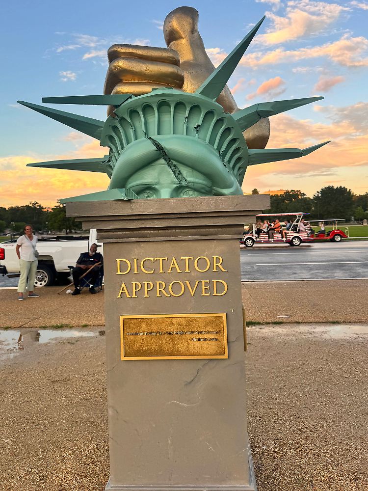 Die Skulptur zeigt eine goldene Hand, die ein Abbild des Kopfs der New Yorker Freiheitsstatue niederdrückt. Dazu prangen in goldenen Buchstaben die Worte: "Dictator Approved", was soviel heißt wie: "Vom Diktator genehmigt". Auf dem Sockel sind folgende Zitate von umstrittenen Regierungs- und Staatschefs über Trump zu finden.