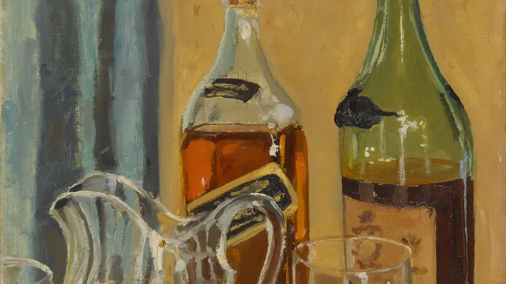 Das Ölgemälde "Jug with Bottles" aus den 1930er-Jahren zeigt eine Flasche des "Johnnie Walker Black Label"-Whiskys neben einer Flasche Brandy mit einem Henkelkrug und Gläsern. Das alkoholische Ensemble spiegelt nach Angaben von Sotheby's Churchills Vorliebe für den Whisky wider.
