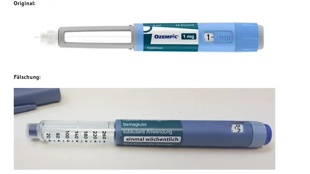 Falls gefälschte Medikamente auftauchten, müssten diese in eine Apotheke gebracht werden. Die Originalpräparate des Herstellers Novo Nordisk seien nicht gefährlich. Die Originale seien von den Fälschungen optisch leicht zu unterscheiden, schreibt das Regierungspräsidium und verbreitet Fotos dazu. Ozempic wird als Injektion unter die Haut gespritzt. Bei der Originalspritze ist der drehbare Ring im hinteren Bereich demnach hellblau. Bei der Fälschung ist er grau. Der Injektionsknopf am Ende der Spritze ist bei der Originalspritze grau und bei der Fälschung blau.