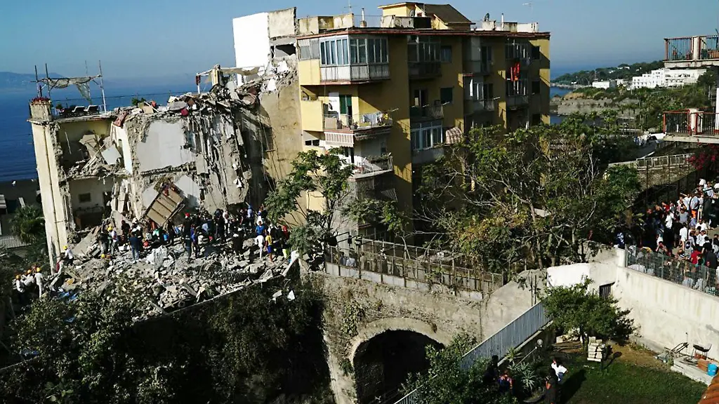 Bilder der Verwüstung wie nach einem Erdbeben: In der Nähe von Neapel ist ein Mehrfamilienhaus eingestürzt und hat möglicherweise acht Bewohner verschüttet. Zwei Familien könnten betroffen sein, twitterte die Feuerwehr. Einsatzkräfte suchten mit Hilfe von Spezialhunden nach den Vermissten.