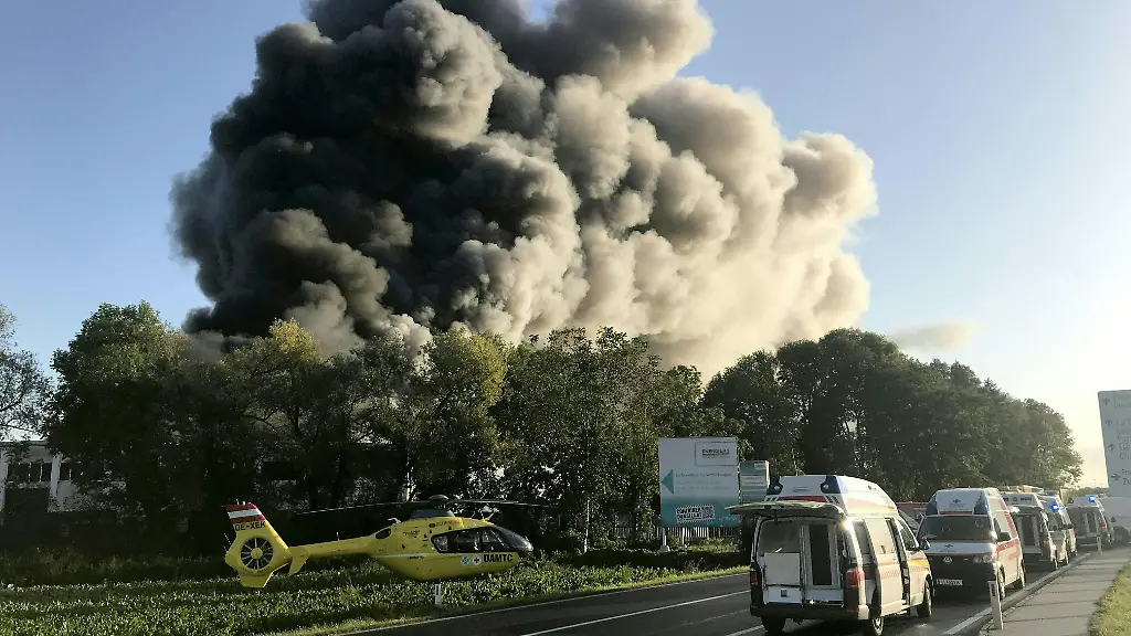 Update 11.17 Uhr: Laut "Kronenzeitung" handelt es sich um drei Schwerverletzte sowie sechs weitere Veretzte. Offenbar versucht die Feuerwehr derzeit, die verbliebene Halle auf dem Gelände zu retten. Zwei Hallen seien bereits eingestürzt.