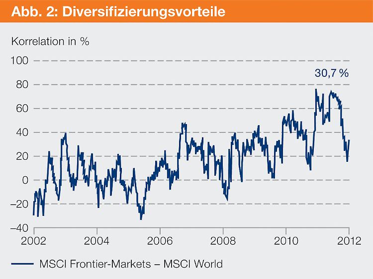 Einer der Gründe für ein Investment in Grenzmärkte sind die signifikant guten Diversifizierungsmöglichkeiten in dem von Unsicherheiten beherrschten aktuellen globalen Makroumfeld. Die Korrelationen der Frontier-Märkte mit den Indizes MSCI World und S&P GSCI sind in der Regel gering. Auch die Wechselbeziehungen innerhalb des Marktes sind unter den Entwicklungsländern niedrig, was auf die eher lokal orientierte Natur ihrer Volkswirtschaften zurückzuführen ist.