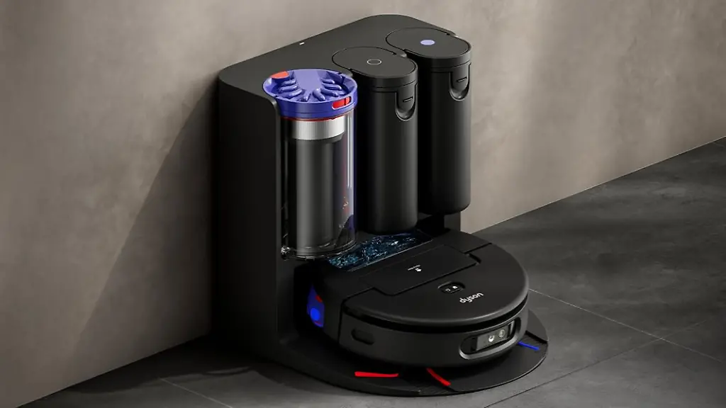 Von denen übernimmt der Roboter auch die Filtration, die Staubpartikel bis zu einer Größe von 0,1 Mikrometern aus der Luft holt. Während des Saug- und Wischvorgangs reinigt der Dyson Spot+Scrub AI sich laut Hersteller permanent selbst. Spätestens beim Andocken an der Station bringt er dann das komplette System auf Vordermann, wechselt das Wasser, entleert den Schmutzbehälter und reinigt die Walzen mit heißem Wasser.