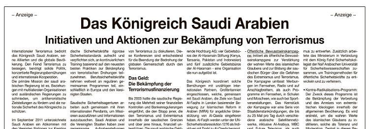 - In einer ganzseitigen Anzeigen erklärt Saudi-Arabien, was es alles gegen den Terrorismus unternimmt.