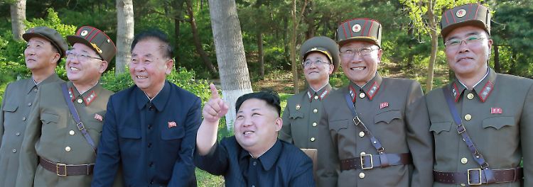 Was fliegt denn da? Nordkoreas Diktator Kim (M.) beobachtet am gestrigen Montag einen Raketenstart.
