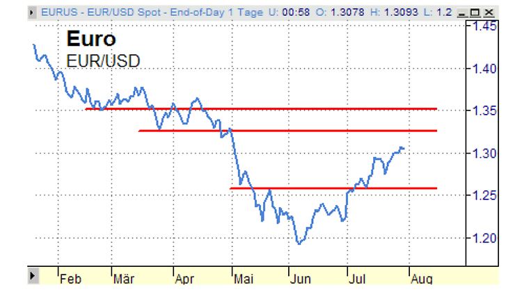 Damit hat sich das weltweit wichtigste Währungspaar aber auch schon in einen Bereich gehangelt, der langsam aber sicher für eine Konsolidierung der Zwischengewinne gut wäre. Denn der Ansturm seit dem Juni-Tief war bisher nur mit kleinen Korrekturen verlaufen. Allerdings muss man zugestehen, dass der Widerstandsbereich, der den Euro gegen den Greenback in eine Pause führen sollte, durchaus breit ist. Mit dem Erreichen der 1.31er Marke ist lediglich die Unterseite dieser Zone erreicht, die allerdings locker bis 1.33 oder aber sogar bis zur 50 % Retracement-Marke bei rund 1.35 reicht.