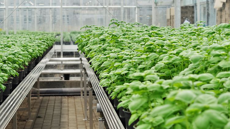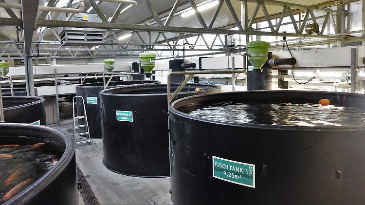 Bevor er die Tür zu den Fischen öffnet, pumpt Nicolas Leschke aus einem Spender an der Wand Desinfektionsmittel in seine Handflächen und verreibt es gründlich. Seine Schuhe stecken in blauen Plastiküberziehern, vor der Tür liegt eine Desinfektionsmatte. Die Prozedur ist Pflicht: Wer zu den Barschen will, muss erst durch die Hygieneschleuse. In dem großen Raum mit den mannshohen schwarzen Tanks ist es feuchtwarm, es brummt, rauscht und gluckert geschäftig. Er ist ein Herzstück der Aquaponik-Farm, die Leschke und sein Partner Christian Echternacht in einem Berliner Industriegebiet betreiben. Das andere ist das Gewächshaus nebenan. Hier ist es taghell und angenehm ruhig, das satte Grün von Hunderten Töpfen Basilikum schafft ein freundliches Licht.