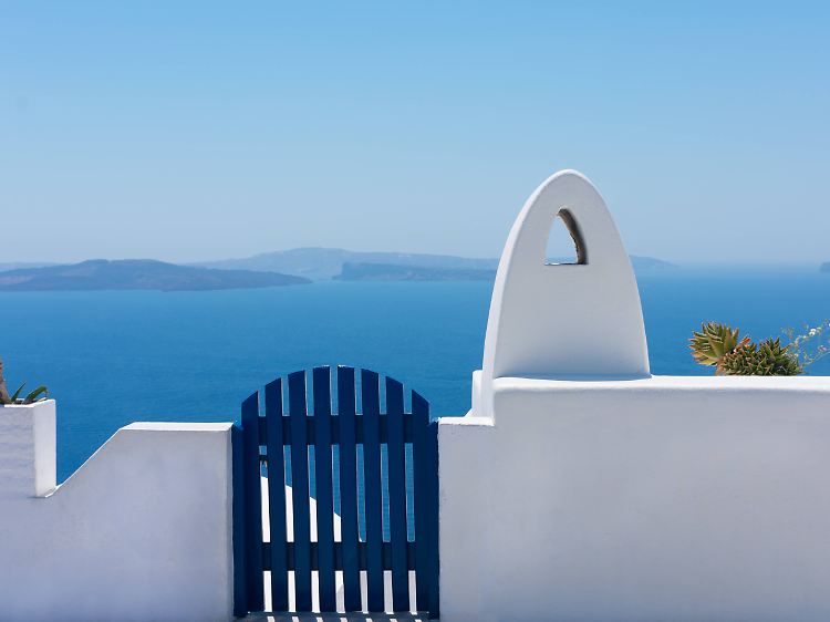 Ein anderes Beispiel. Diesmal Santorini. Die griechische Insel gräbt sich bei allen Besuchern durch ihre Farben ins Gedächtnis: Blau und Weiß. Dazu schwarzer Sand. Gar nicht so schwer, auch zu Hause ein Stück Griechenland zu verwirklichen. Manchmal reichen dazu ganz wenige Accessoires. Auf diesem Bild zum Beispiel ist die blaue Tür ein echter Hingucker. Vielleicht kann man in diesem Blau einen Tisch streichen.