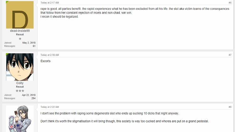 Dead-inside99: "Vergewaltigung ist etwas Gutes. Beide Parteien profitieren davon. Der Vergewaltiger erfährt endlich das, was ihm Zeit seines Lebens verwehrt worden ist. Und die Schlampe aka. das Opfer lernt, was ihre ständige Ablehnung von unfreiwillig Enthaltsamen für Konsequenzen hat."