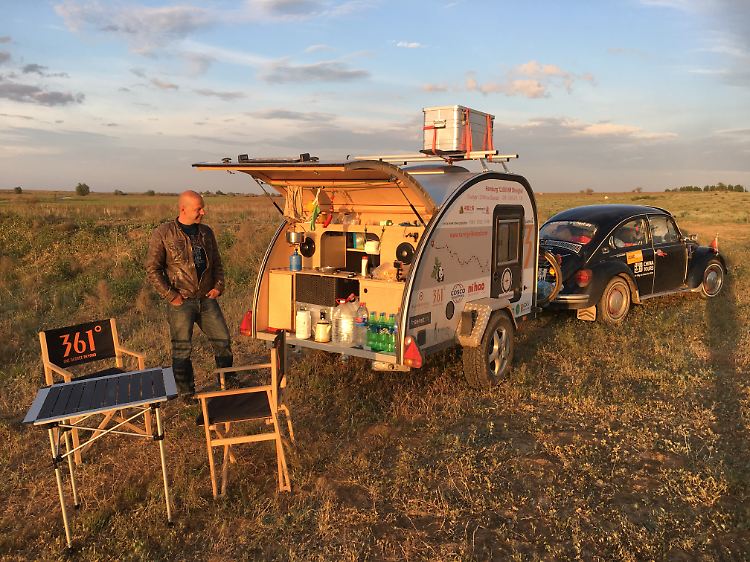 Ursprünglich habe ich keinen Fahrer für ein Begleitfahrzeug mit meinem Equipment gefunden. Ich habe es dann so geplant, dass ich es alleine durchziehen kann. Doch vier Wochen vor Start hat sich Victor Neubauer, der die Route mit mir geplant hat, gemeldet. Er wollte mit seinem 1984er Käfer mitfahren, inklusive kleinem Wohnanhänger.