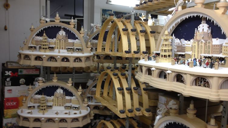 Auch die gelernte Holzspielzeugmacherin Jenny Mattheß, die heute die Manufaktur Klaus Kolbe leitet, ist mit dem erzgebirgischen Weihnachtszauber aufgewachsen. Sie saß schon als kleines Mädchen in der Werkstatt ihres Großvaters, der den Betrieb nach der Wende gegründet hatte, und bastelte mit den Holzabfällen. Heute leitet sie das Unternehmen mit 15 Mitarbeitern, das rund 6000 Schwibbögen im Jahr fertigt und in die ganze Welt exportiert, und führt das Werk ihres Opas weiter. "Er war unwahrscheinlich kreativ und recherchierte minutiös für jeden Schwibbogen, beschäftigte sich intensiv mit der Geschichte, damit seine Figuren wahrheitsgetreu waren", sagt Mattheß im Gespräch mit ntv.de. Eine Sonderedition der Dresdener Frauenkirche, die die Manufaktur 2003 zum Anlass des Wiederaufbaus fertigte, wurde zum Verkaufsschlager. Kunden überboten sich, um einen der auf 1000 Stück limitierten Schwibbögen zu ergattern.