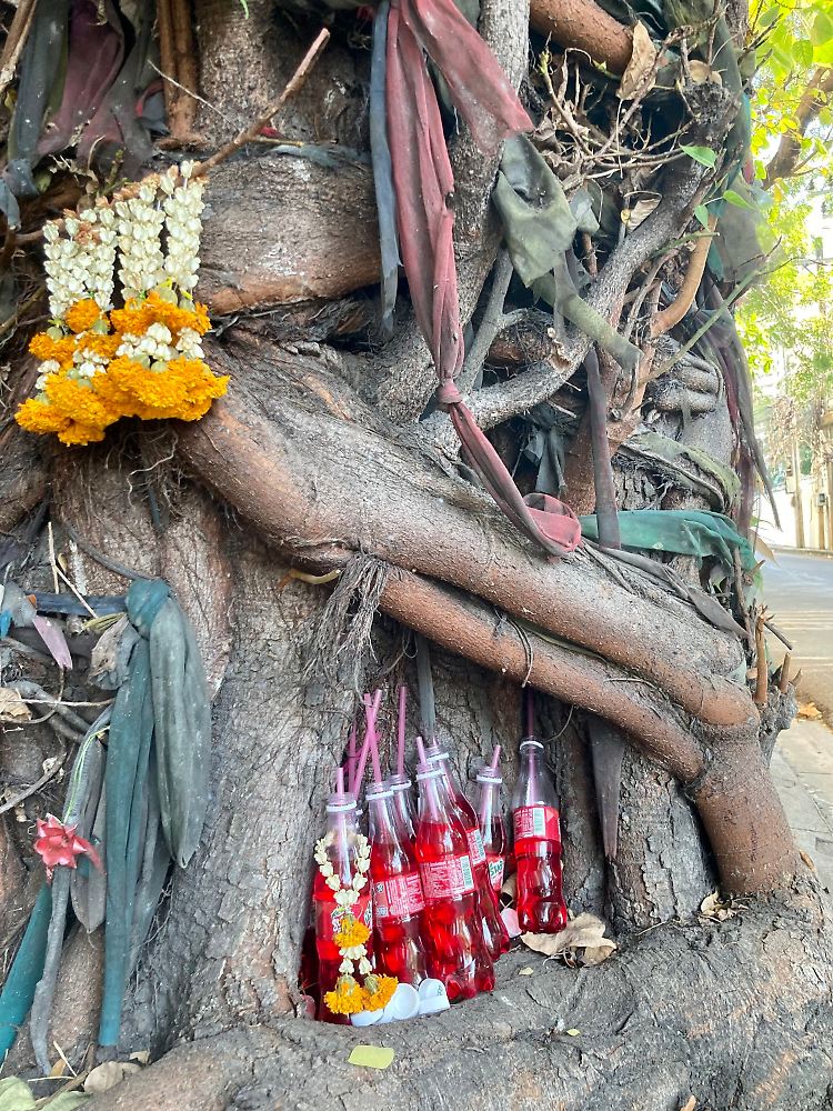 Wo ein Schrein oder ein besonders verwurzelter Baum steht, sind Flaschen mit knallroter Limo in Thailand nicht weit - samt Strohhalm, der in Richtung der Geister platziert wird.