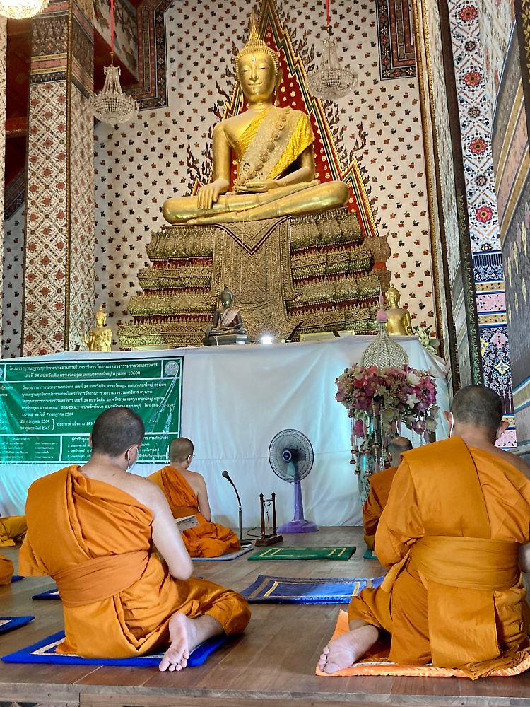 Mönche rezitieren Mantras im berühmten Tempel Wat Arun in Bangkok. Es gilt als inakzeptabel, Buddha-Figuren die Füße zuzuwenden.