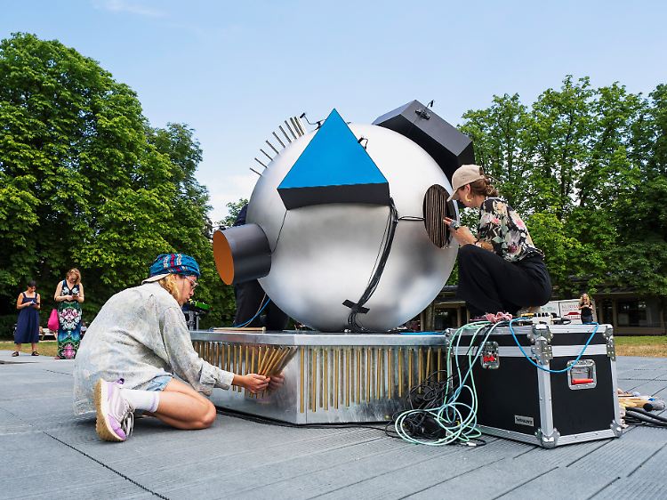 Die Skulptur, die dem Publikum neue Klangwelten eröffnet, heißt "Public Resonator". Zum ersten Mal ist diese Plastik öffentlich bespielbar. Obwohl die Künstlerin sich über diese Gelegenheit gefreut hatte, war sie doch erschrocken, als sich zuallererst ein Schwarm spielender Kinder der Kugel bemächtigte. "Wir hatten gerade alles installiert, der Resonator war nagelneu, aufwändig in einer Metallwerkstatt produziert worden, und die Kinder hämmerten wie wild drauf herum", erinnert sie sich beim Gespräch mit ntv.de in Berlin, wo sie lebt und arbeitet. Peu à peu merkten die Kids, dass sie Töne produzieren können, wenn sie sanfter sind. "Ich musste mich tatsächlich einen kurzen Moment daran gewöhnen, dass hier im Park jeder meinem Werk Töne entlocken darf. Ehrlich gesagt hatte ich das so nicht erwartet. Jetzt ist es ein tolles Gefühl, zu sehen, wie viele Menschen die Skulptur annehmen."