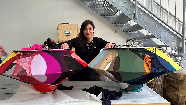 Neues Leben für Nylonstrümpfe: Nevin Aladağ in ihrem großzügigen Atelier in Berlin-Lichtenberg mit zwei "Color Floating"-Lichtskulpturen.