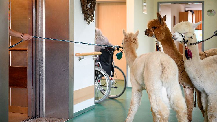 Dinter züchtet die flauschigen Tiere. Neben Wanderungen für Jedermann und etwas anderen Kindergeburtstagen bietet die ausgebildete Fachkraft, wie hier, auch tiergestützte Therapie an. Während die Alpakas sich neugierig in der neuen Umgebung umschauen, erklärt sie: "All das, was wir hier machen, das ist wirklich für die eine Höchstleistung." In ein Auto steigen, ein Halfter tragen, mit Menschen in Aktion zu treten - "das sind alles Sachen, die wirklich lange trainiert wurden". Nicht jedes Tier sei dafür gleich geeignet. Doch die Hengste, die sie heute mitgebracht hat, scheinen keine Berührungsängste zu haben. Wie selbstverständlich laufen Hector, Hardes, Pepe und Oskar durch die Flure und schauen neugierig in die Zimmer.
