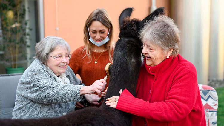 Die 82-jährige Emmi Kreudzer kennt die sonst in den südamerikanischen Anden wohnhaften Tiere aus Dokumentationen, die sie so gern schaut. "Dass das alles so wirklich ist, wenn man sie anfasst. Das ist doch ganz anders, als wenn man sie nur sieht", sagt sie. "Das erfreut nicht nur Kinder! Das erfreut auch ältere Leute." Die eher nebenbei getätigten Bewegungen bringen laut Dinter Schwung in die meist eingeschränkten Körper. Beim Füttern wird nebenbei das Greifen geübt, fürs Bürsten dann doch mal aus dem Rollstuhl aufgestanden, weil es doch am Hals besonders angenehm für den haarigen Gesellen ist.