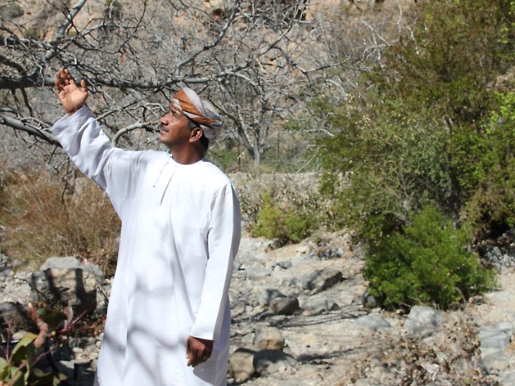 "Einmal im Jahr bringt uns der Khareef unser grünes Wunder", so Souleiman, der Mountain-Guru. Der ortskundige Führer breitet die Arme aus, als könnte er ihn schon spüren, den feuchten Monsunwind, der für das Naturschauspiel verantwortlich ist. Noch ist hier im Wadi am Rande der Wüste alles trocken, Kamelmütter rupfen an dem Wenigen, was der Boden hergibt, ihre Kleinen folgen ihnen mit tapsigem Schritt.
