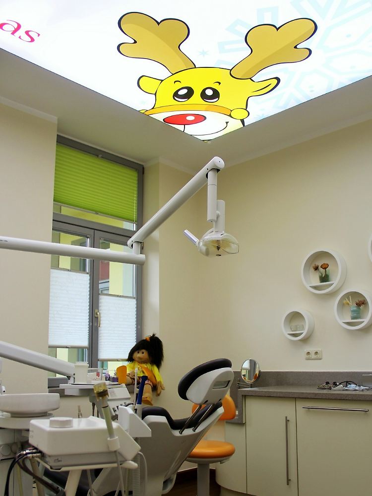 Deckenbilder sind ein sehr spezielles Genre. Die Motive fallen wie der Rest der in deutschen Arztpraxen verbreiteten Kunst meist wenig originell aus. Und doch studieren wir nur selten Bilder so intensiv wie diese an die Decke gedübelten Motive. Zahnärzte waren naturgemäß die Vorreiter des Dekorationstrends. "Ich habe die Deckenbilder circa 18 Jahre", erzählt die Berliner Zahnärztin Marina Schulz. "Ich wollte etwas 'Besonderes' im Sprechzimmer für die Patienten und habe die Idee in einer Fachzeitschrift entdeckt." Die bunten Bildchen sind aber weit mehr als purer Deckenschmuck. Vor allem Kinder und ängstliche Patienten können laut Schulz auf diese Weise von der Behandlung abgelenkt werden.
