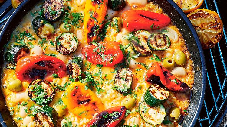 Für Paella eignet sich der Grill bestens, da Sie bei hoher Hitze zuerst das Gemüse rösten können, bevor die Temperatur dann sinkt und der Reis die Safranbrühe aufnehmen kann. So entsteht in geselliger Runde ein wunderbar sommerliches Gericht.
