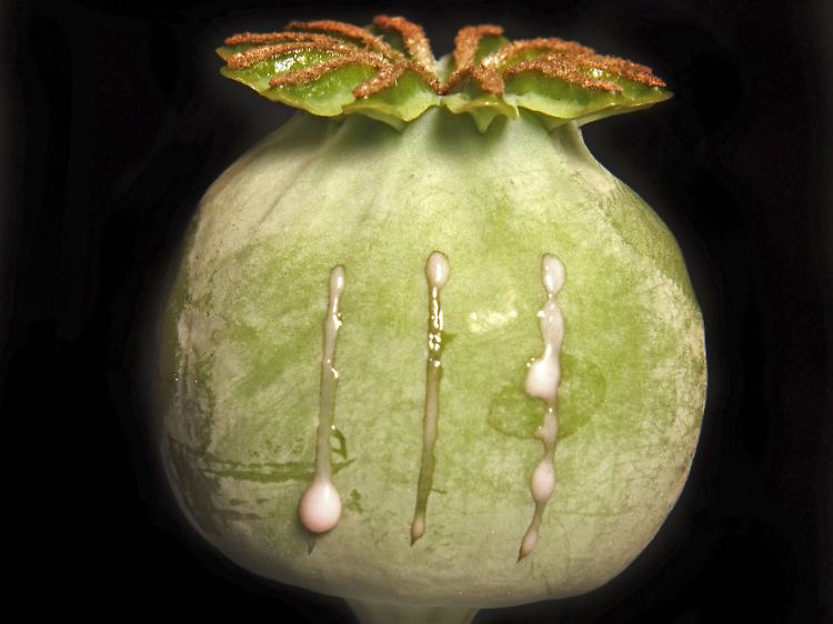 Aus einer angeritzen Schlafmohnkapsel tritt der giftige Milchsaft aus, aus dem Opium gewonnen wird.