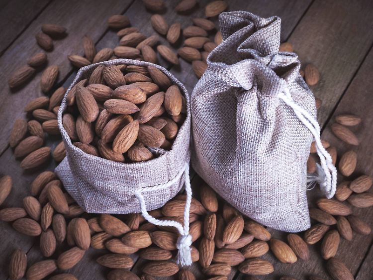 Das Überraschendste: Obwohl Mandeln recht nahrhaft sind, helfen sie sogar beim Abnehmen. Wer Mandeln isst, hat weniger Heißhunger auf Kohlenhydrate, sie sättigen nämlich besser als ein Stück Brot. Zumal man sie wegen ihrer Härte auch länger kauen muss. Wegen ihres Fasergehaltes verwertet der Körper die in den Mandeln enthaltene Energie nicht voll. Studien besagen, dass statt der 170 kcal pro 28 g Mandeln nur 129 kcal verwertet werden. Aus all den Gründen machen Mandeln als Zwischendurch-Snack bei Diäten Sinn. Natürlich keine volle Tüte, sondern 30 bis 60 Gramm pro Tag! Eine Mandel wiegt etwa ein Gramm – und da hat man bei 30 Stück ganz schön zu mümmeln. Am besten mit Schale, weil in der braunen Haut rings um den hellen Kern zehn Prozent Ballaststoffe stecken.