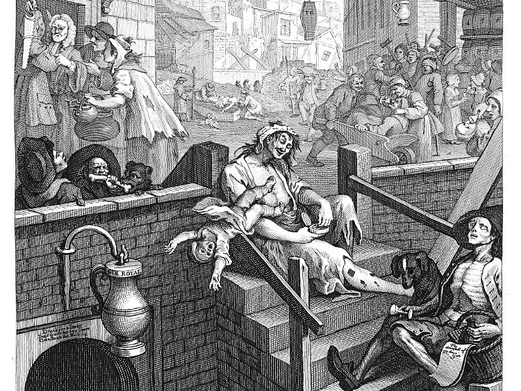 William Hogarths legendäre Radierung "Gin Lane" von 1751 zeigt das zutiefst düstere Bild der gesellschaftlichen Abgründe.