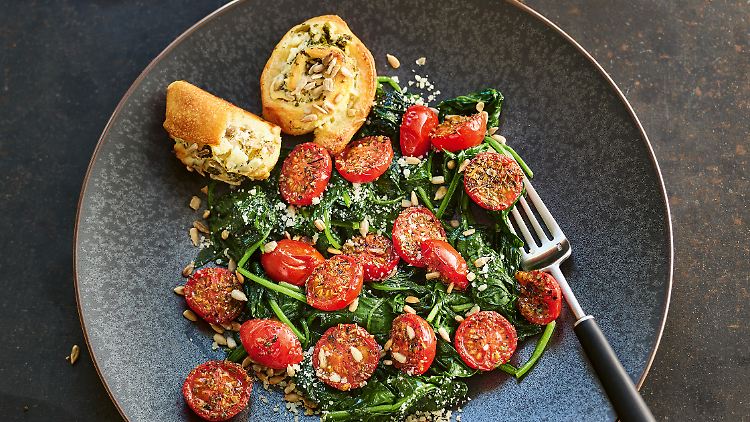 Spinat mit Ofentomaten und Pizzabrot (vegetarisch)