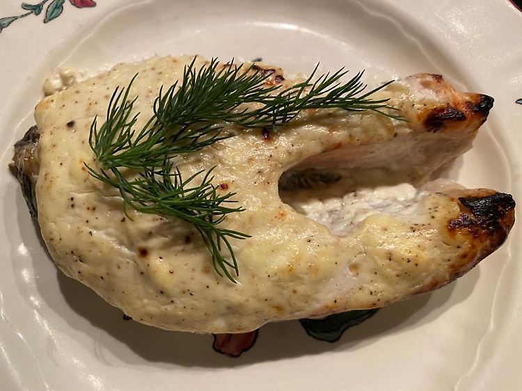 Dann auf die Steaks streichen und diese direkt unter die glühende Grillschlange legen. Es reichen fünf Minuten, dann ist der Lachs unten noch etwas glasig, so wie man das heutzutage gerne isst. Wer es durch mag: sieben Minuten. Der Herd ist ja vom Gratin eh schon vorgeheizt, das passt also gut zusammen. Und während der Lachs grillt, kühlt das völlig überhitzte Gratin ein wenig aus.