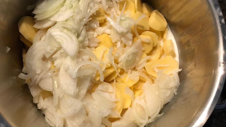 Der Franzose macht ja statt Wodka lieber Wein und Cognac, aber er hat der feinen Küche dennoch was sehr schön Kartoffeliges beigesteuert: das Gratin. Ich verrate Ihnen heute zwei kleine Tricks, damit es nicht so schwer gerät. Denn bei mir im Badischen (wo der Auflauf auch liebevoll "Rahmblättle" genannt wird) muss es nicht die allzu üppige, schwere Variante a la Crème fraîche sein. Statt die Scheiben ausschließlich mit Sahne zu backen, gare ich die Kartoffeln in Milch vor (dann läuft man auch nicht Gefahr, dass die Schnitze, jene "Blättle", im Gratin am Ende noch zu bissfest sind), gebe ein gutes Drittel Sahne dazu und erreiche so eine nur moderate Belastung der Galle.