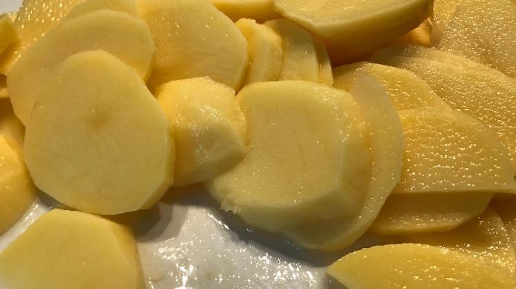 Die Kartoffeln waschen und schälen. In ca. 1 cm dünne Scheiben schneiden. Trick: Auf die Schnittfläche der 1. Scheibe stellen, dann hat die Kartoffel einen sicheren Halt.