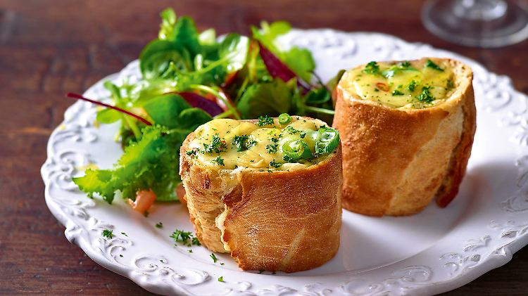Von einem schlanken Baguette gut 5–6 cm dicke Scheiben abschneiden. Diese so aushöhlen, dass auf allen Seiten eine dünne Schicht Brot bleibt und eine Art Kästchen entsteht. Die Brotkästchen auf ein Backblech setzen und mit der Käsemischung füllen.