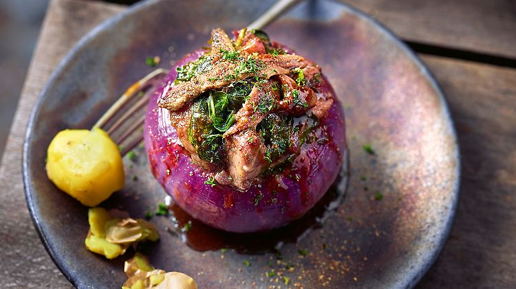 Das Lammfleisch schnetzeln und mit der Speisestärke durchkneten. In einer Pfanne in 2 EL Olivenöl unter Rühren rasch kross braten, das gehackte Innere der Zwiebeln und den Knoblauch zufügen. Sobald alles etwas Farbe angenommen hat, den Rotwein angießen und fast vollkommen verkochen lassen. Nach Belieben mit Balsamico aromatisieren.