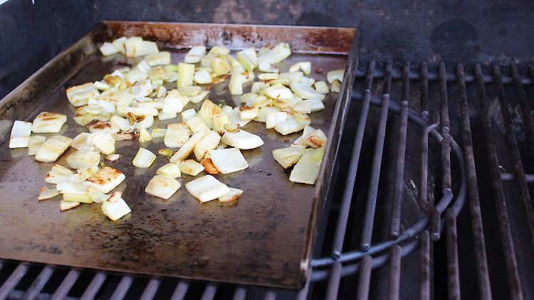 Die zweite Möglichkeit ist, den Fenchel auf einer sogenannten Feuerplatte (auch Plancha genannt) zu grillen. Die gibt es als Grillzubehör zu kaufen. Man legt dabei die Eisenplatte auf den Grill und erhitzt sie. Ein Vorteil: Es gibt viele Plancha-Rezepte, bei denen man eher kleineres Grillgut auflegt, wie Garnelen, Minitomaten oder in Scheiben geschnittene Zwiebeln. Und dieses fällt einem dabei eben nicht durch den Rost.