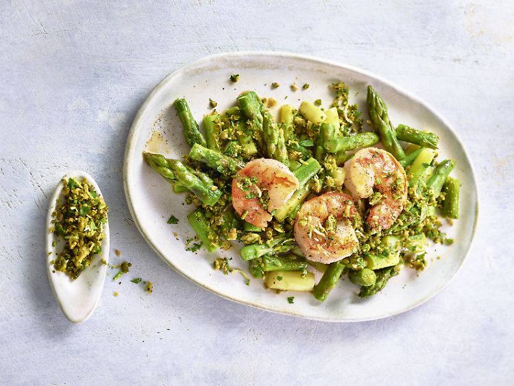 Garnelen mit Spargel und Oliven-Pistazien-Topping (LC-HiFi-Phase 1)