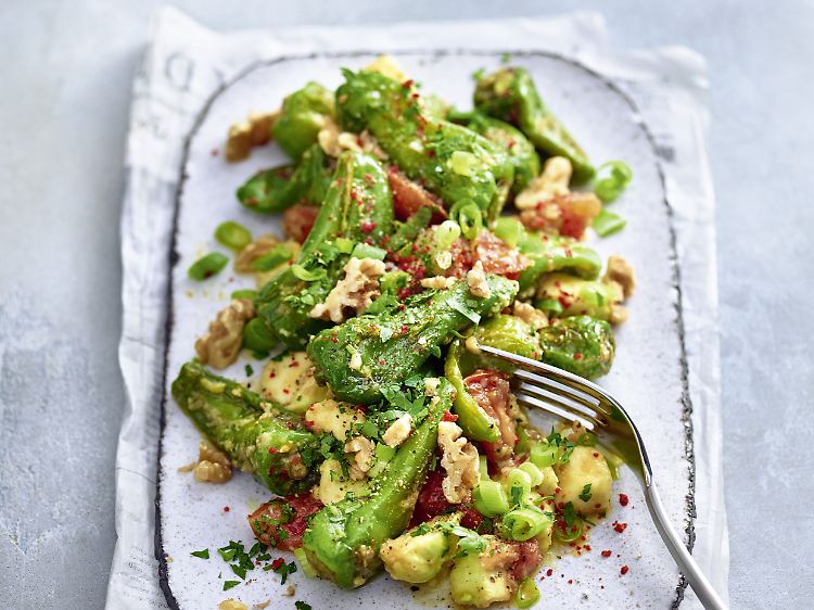 Die Pimientos waschen und trocken tupfen, die Stiele abschneiden. Frühlingszwiebeln putzen, waschen und die weißen und grünen Teile separat in Ringe schneiden. Die Tomaten waschen, vierteln und die Stielansätze dabei wegschneiden. Die Avocado halbieren, entkernen, das Fruchtfleisch mit einem Löffel aus der Schale lösen und grob würfeln. Die Petersilie abbrausen, trocken tupfen und hacken. Die Walnusskerne grob hacken.