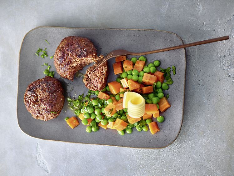 Währenddessen die Petersilie abbrausen, trocken tupfen und hacken. Das Gemüse mit den Frikadellen auf einem Teller anrichten, die Butter in Flöckchen auf das Gemüse geben und schmelzen lassen. Mit der gehackten Petersilie bestreuen und servieren.