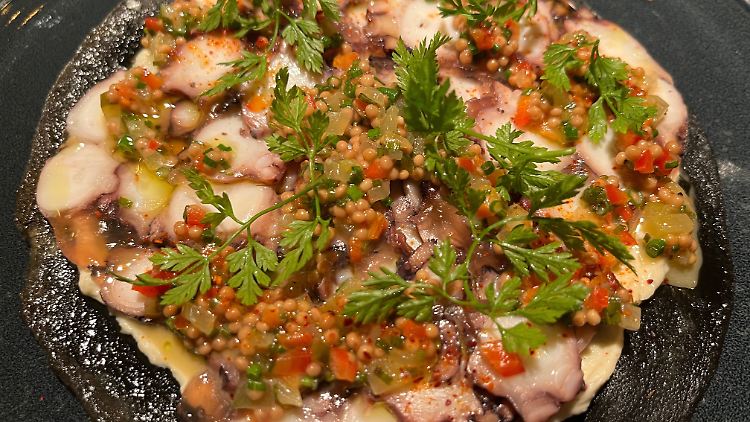 Wenn ein Halbgrieche kocht und ein Lokal Phaedra heißt, dann gibt das die Richtung vor. Die Gerichte haben aber absolut nichts zu tun mit dem oft lieblos gemachten Standardkram, den man beim Durchschnittsgriechen bekommt. Hier eher griechische Wurzeln und der Rest moderat moderne, pfiffige, mediterran inspirierte Küche. Kostproben? Jawohl! Vorspeise 1: Schwarzes, mit Tintenfischtinte gefärbtes hausgemachtes Pitabrot. Darauf ein perfekt abgeschmecktes Taramas, darauf wiederum hauchdünne Scheiben von saftigem, zartem Oktopus, ein wenig rote Paprika und Kerbel. Der Kick kommt durch marinierte Senfsaat. Tolle Idee!