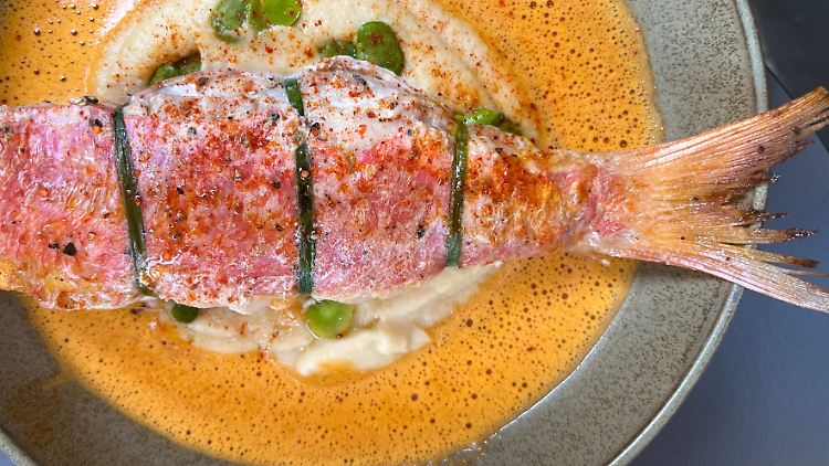 Star auf dem Teller ist die Sauce! Jeder Saucenanbeter wird hier von Glückshormonen überschwemmt. Tzipas hat die Jus klassisch gemacht, aber das muss man halt können. Köpfe und Gräten von großen wilden Wolfsbarschen, Hummerkarkassen, Mirepoix, Fenchel, Fenchelsamen, Koriandersamen, Lorbeer, Knoblauch, Estragon und Safran werden in Olivenöl angeschwitzt, mit Pernod abgelöscht, flambiert und dann mit guten Pelati drei bis fünf Stunden geköchelt, passiert, mit kalter Butter montiert und mit Salz, Zitronensaft, Piment d’Espelette und Mandarinenöl abgeschmeckt. Der Teller kostet 36 Euro. Ein besseres Genuss-Mengen-Preis-Verhältnis ist für mich nicht vorstellbar.