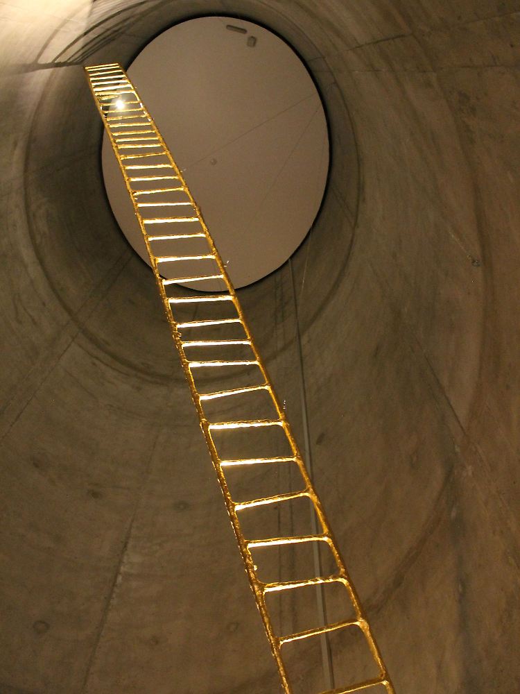 Wer die Kirche betritt, passiert eine besondere Konstruktion mit einem siebeneinhalb Meter hohen Lichttunnel und goldener Leiter: "Genau, das ist die Himmelsleiter von Jakob und dort oben befindet sich der Glockenturm". An seiner Außenseite sind aus goldfarbenen Mosaiken bildlich-symbolische Darstellungen der zwölf Apostel zu sehen. Alles, was in der Kirche aus Holz gefertigt wurde, wie die Stühle und der Fußboden, ist aus massiver Eiche.