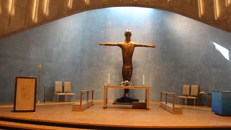 Auch wenn der Innenraum genauso ungewöhnlich wie das Äußere ist und keine regelmäßigen Formen hat, wird der Blick der Besucher auf den Altarraum gelenkt. "Da vorn befindet sich eine große Christusskulptur aus Bronze. Sie wiegt zwei Tonnen und ist in der Toskana gefertigt worden." Dieser ungewöhnliche, 4,3 Meter hohe Gekreuzigte ohne Kreuz hat seinen Kopf nach oben gestreckt. "Er strahlt Hoffnung und Zuversicht aus", sagt Handke und verweist auf das Licht, das durch die Fenster auf ihn fällt. Seine rechte Hand ist zur Faust geballt: "Das symbolisiert immer Kraft, Macht, Kampf". Während seine linke Hand offen und ausgestreckt ist. "Das heißt: sei willkommen! Und wer genau hinschaut, entdeckt so ein jüdisches Gebetsband. Das erinnert daran, dass Jesus Christus Jude gewesen ist."