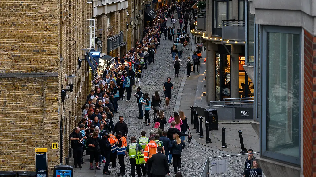 Um von der Queen Abschied zu nehmen, stellen sich Zigtausend Menschen in London in eine Warteschlange. Nachdem diese auf mehrere Kilometer Länge anwächst, zieht die Regierung die Reißleine und verkündet einen Anstell-Stopp. Dennoch strömen weiter Menschen ans Ende der Schlange.