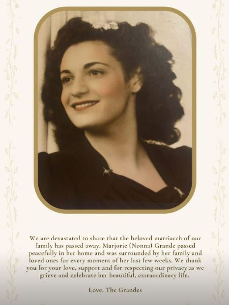 Ariana Grande verewigte die Stimme ihrer Oma vergangenes Jahr auf dem Album "Eternal Sunshine". Marjorie Grande ist in dem Stück "Ordinary Things (feat. Nonna)" zu hören. Für ihren Auftritt bei den MTV Video Music Awards im Jahr 2018 hatte Grande bereits ihre Großmutter und ihre Mutter Joan für das Finale ihres Songs "God is a Woman" auf die Bühne geholt.