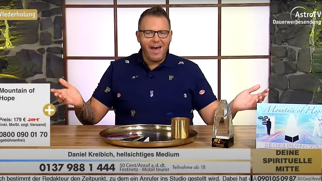 Da werden dann etwa "zwei wundervoll miteinander harmonierende Energiekerzen" von einem aus dem Programm bekannten "Medium" für schlappe 84 Euro verkauft. Oder eine aus simplen Glassteinen bestehende "Energiekette" für 69,95 Euro. Die Moderatorinnen und Moderatoren rühren für den Nippes, der die Sahnehaube auf ihren Heilsversprechen ist, natürlich kräftig die Werbetrommel.
