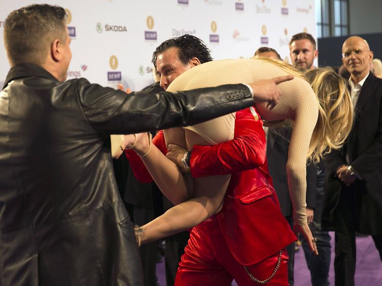 Hoppe hoppe Reiter, wenn sie fällt, dann schreit er womöglich: Till Lindemann schnappte sich Thomalla beim Echo auf dem lila Teppich.