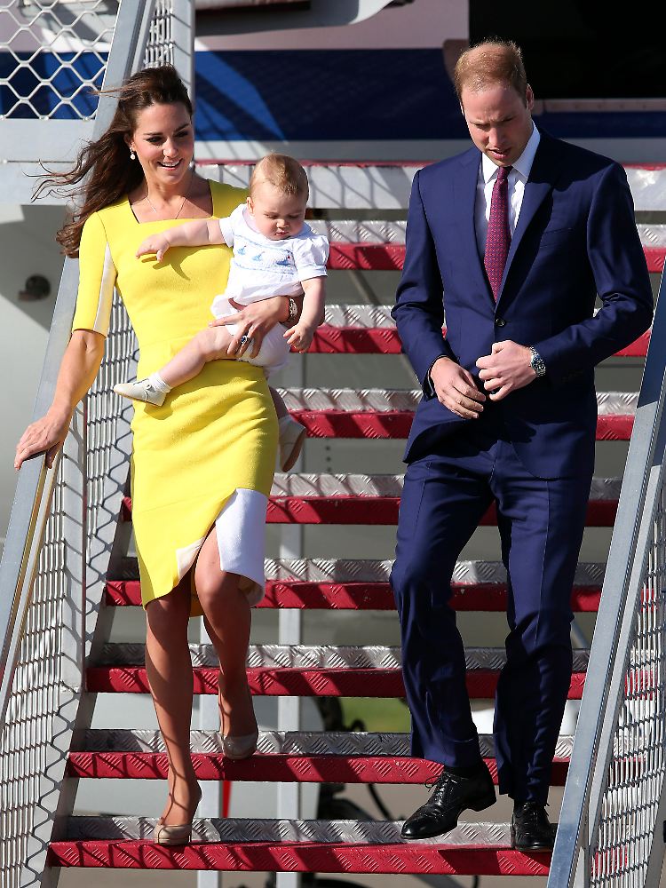 Kate trug Prinz George im Arm, als das Paar am Kingsford-Smith-Flughafen in Sydney vom australischen Premierminister Tony Abbott und von Generalgouverneur Peter Cosgrove, dem Statthalter der britischen Königin Elizabeth II., begrüßt wurde. Für den Nachmittag war ein großer Empfang in der Oper geplant.