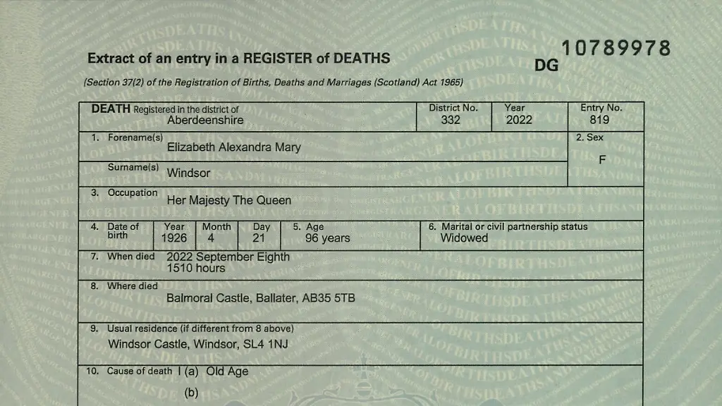 Die britische Königin Elizabeth II. ist an Altersschwäche gestorben. Das geht aus dem Totenschein der am 8. September im Alter von 96 Jahren auf ihrem schottischen Landsitz Balmoral gestorbenen Monarchin hervor. Sie starb um 15.10 Uhr Ortszeit (16.10 Uhr MESZ), wie in dem von einer schottischen Behörde veröffentlichten Auszug des Dokuments vermerkt wurde.