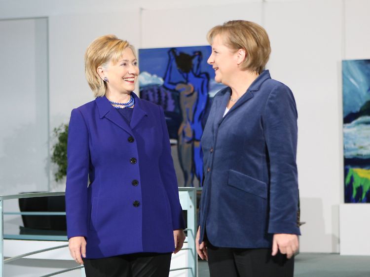 Die Damen in Blau: Zwischen Clinton und Merkel scheint die Chemie zu stimmen.