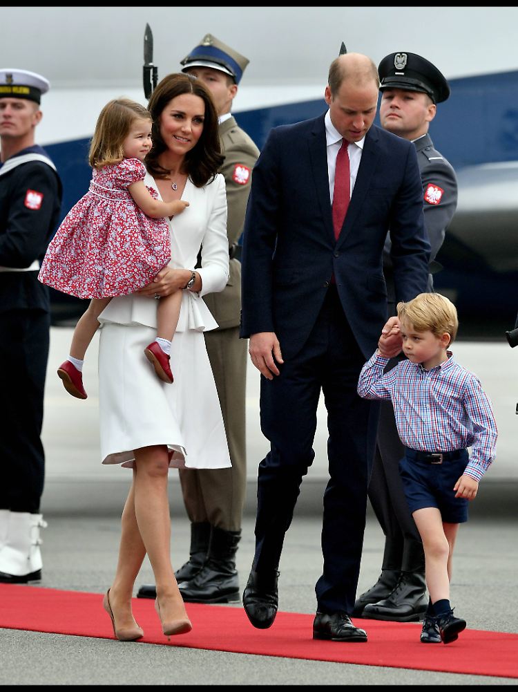Die Kinder waren beim öffentlichen Auftritt des Prinzenpaares zwar nicht dabei. Für Begeisterung sorgten aber Fotos von ihrer Ankunft am Warschauer Flughafen: Prinz George klammerte sich an die Hand von Vater William. Mama Kate - ganz in Weiß - hielt Töchterchen Charlotte - im rot gemusterten Blumenkleid - auf dem Arm. Gemeinsam waren die Damen damit auf die polnischen Nationalfarben abgestimmt.